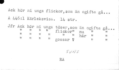 //// Ack hör ni unga flickor,som än ogifta gå... //// A 446:1 Kärleksvisa. 14 str. //// - //// Jfr Ack hör ni unga töser,som än ogifta gå... ! //// ' " " flickor" nu " //// " " " " " " här " " //// " " " " gossar V " " //// } //// - //// t ////