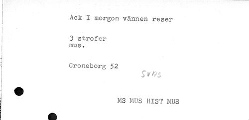 //// Ack I morgon vännen reser //// ! 3 strofer //// mus. //// - //// ^ Croneborg 52 //// i //// j //// t //// _ //// l MS MUS HIST MUS ////