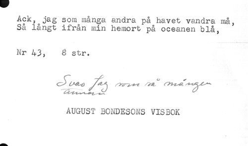 //// Ack, jag som många andra på havet vandra må, //// Så långt ifrån min hemort på oceanen blå, //// . - ... ....... .... ...... . -----.... //// Nr 43, 8 str. //// AUGUST BONDESONS VISBOK ////