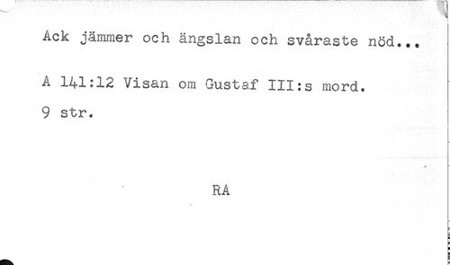 //// Ack jämmer och ängslan och svåraste nöd... //// A 141:12 Visan om Gustaf III:s mord. //// 9 str. //// RA //// * //// ) //// S ////