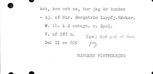 //// Ack, kom och se, hur jag är bunden //// - sj. af Mar. Bergström Lappfj.Härkar. //// W. 11. 4 2 omtagn. n. Spol. //// V. af 587 M. ^ ^ ^ //// Del II nr 609 //// i //// RANCKEN FÖRTECKNING ////