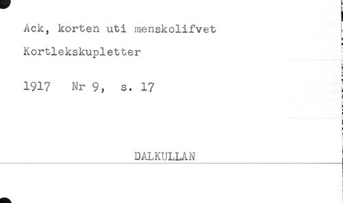 //// Ack, korten uti menskolifvet //// H //// Kortlekskupletter //// 1917 Nr 9, s, 17 I //// c //// ! //// H //// it //// r //// L //// _DALKULLAN_ //// i //// ! //// < //// t ////