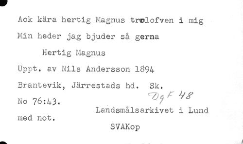 //// Ack kära hertig Magnus trolofven i mig //// Min heder jag bjuder så gerna //// Hertig Magnus //// Uppt. av Nils Andersson 1^94 //// Brantevik, Järrestads hd. Sk. //// No 76:43. . T^vf //// Landsmålsarkivet i Lund //// med not. //// SVAKop ////