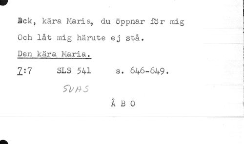 //// Bck, kära Maria, du öppnar for mig //// Och låt mig härute ej stå. //// L //// Den kära Maria. I //// 7:7 SLS 541 s. 646-649. //// } //// ! //// i //// ÅBO ////
