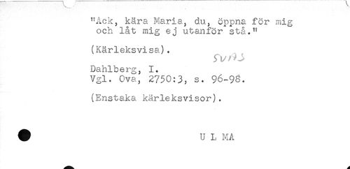 //// "Ack, kära Maria, du, öppna för mig //// och låt mig ej utanför stå." //// (Kärleksvisa). //// Dahlberg, 1. //// Vgl. Ova, 2750:3, s. 96-93. //// (Enstaka kärleksvisor). //// # U L MA ////