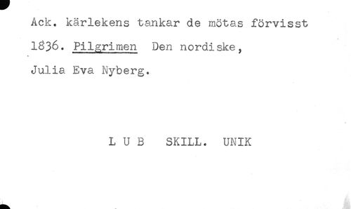 //// Ack. karlekens tankar de mötas förvisst //// + //// 1836. Pilgrimen Den nordiske, //// Julia Eva Nyberg. //// L U B SKILL. UNIK ////