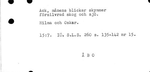 //// Ack, månens blickar skymmer //// ' försilvrad skog och sjö. //// Hilma och Oskar. //// t //// t //// ! //// 15:7. IÖ. S.L.S. 260 s. 135-142 nr 15. //// < //// ! //// ÅBO //// ! //// ! ////