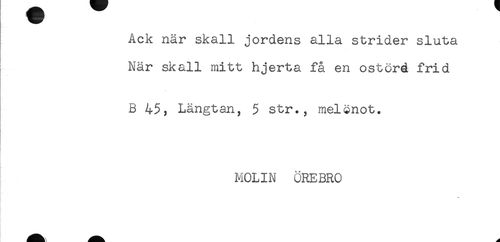 //// Ack när skall jordens alla strider sluta //// När skall mitt hjerta få en ostörd frid //// B 45, Längtan, 5 str., melönot. //// MOLIN ÖREBRO ////