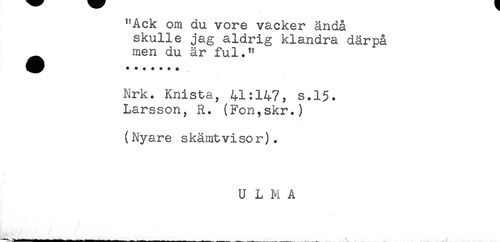//// -RCK om au vore vacker ända //// skulle jag aldrig klandra därpå //// men du är ful." //// Nrk. Knista, 41:147, s.15. //// Larsson, R. (Fon,skr.) //// (Nyare skämtvisor). ////