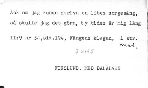 //// Ack om jag kunde skriva en liten sorgesång, //// så skulle jag det göra, ty tiden är mig lång //// ! //// 11:9 nr 54,sid*194, Fångens klagan, 1 str. //// J ' ! //// ! //// t //// t //// FORSLUND. MED DALÄLVEN //// : ////