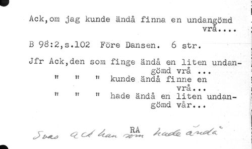//// a //// Ack,om jag kunde ändå finna en undangömd //// vrå.... ; //// B 93:2,s.102 Före Dansen. 6 str. //// Jfr Ack,den som finge ändå en liten undan- //// gömd vrå ... ^ //// " " " kunde ändå finne en { //// vrå... ; //// " " " hade ändå en liten unda