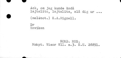 //// Ack, om jag kunde ändå //// lajtalita, lajtalita, slå dig ur ... //// ^ (melönot.) K.A.Rignell. //// Dr //// Enviken //// NORD. MUS. //// Mskpt. Visor VII. s.3. E.U. 28891. ////