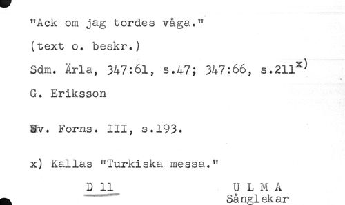 //// "AcK om jag tordes vaga." //// (text o. beskr.) //// Sdm. Arla, 347:61, s.47; 347:66, s.211^^ //// G. Eriksson //// Sv. Forns. III, s.193. //// x) Kallas "Turkiska messa." //// D 11 U L M A //// ^ Sånglekar ////