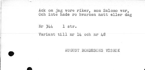 //// Ack om jag vore riker, som Salomo var. //// Och inte hade ro hvarken natt eller dag //// *i //// Nr 344 1 str. //// i //// i //// Variant till nr 14 och nr 46 //// * //// ^ AUGUST.BONDESONS VISBOK //// ! ^^ ^ ////