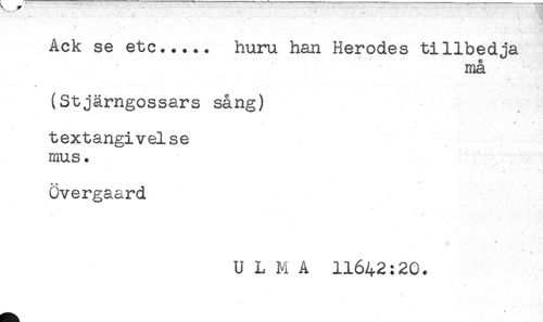//// Ack se etc..... huru han Herodes tillbedja //// må //// * . //// (Stjärngossars sång) //// < //// textangivelse //// mus. //// övergaard //// U L M A 11642:20. ////