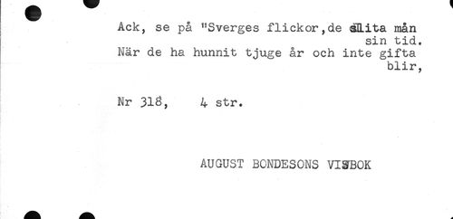 //// Ack, se på "Sverges flickor,de élLita mån //// sin tid. //// När de ha hunnit tjuge år och inte gifta //// blir, //// Nr 318, 4 str. //// * - ' //// AUGUST BONDESONS VISBOK ////