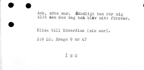 //// Ack, söta mor. Oändligt han rör mig //// Allt den den dag hah blåv mitt försvar. //// Elise till Bdvardina (sin mor). //// 2:9 LO. Brage 9 nr 47 //// - //// ÅBO //// - //// j //// B //// t* ////