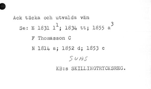 //// Ack täcka och utvalda vän //// Se: E 1331 iN 1834 tt; 1655 a //// F Thomasson C //// N 1814 a; 1852 d; 1853 c //// KB:s SKILLINGTRYCKSREG. ////