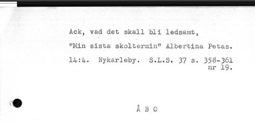 //// - //// * ' ' ' . - - . - .. - .. _ , //// . ' - <. ' ' * * - ' //// Ack, vad det skall bli ledsamt, //// , * *** * -* * //// "Min sista skoltermin" Albertina Petas. //// 14:4. Nykarleby. S.L.S. 37 s. 35^-361 //// nr 19. ////