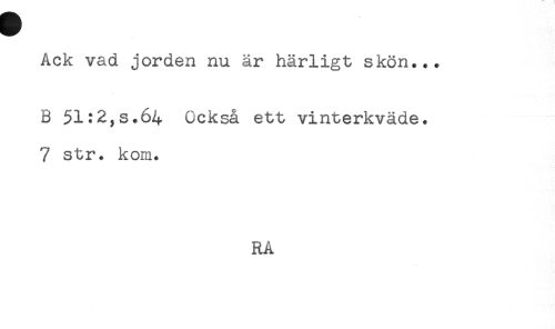 //// Ack vad jorden nu är härligt skön... //// B 51:2,s.ö4 Också ett vinterkväde. //// 7 str. kom. //// RA ////