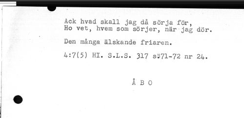 //// * *-- - - ^ //// - //// * * ' ' //// Ack hvad skall jag då sörja för, //// Ho vet, hvem som sörjer, när jag dör. //// * //// Den många älskande friaren. //// - //// 4:7(5) Hl. S.L.S. 317 S371-72 nr 24. //// ] //// < //// i //// ÅBO //// t //// i ////