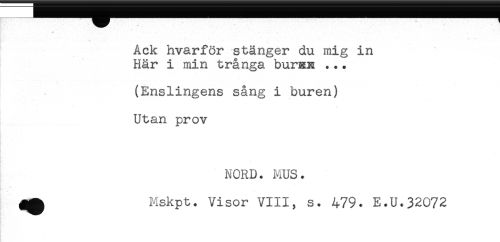 //// Ack hvarför stänger du mig in //// Här i min trånga burRN ... //// (Enslingens sång i buren) //// Utan prov //// - //// * //// NORD. MUS. //// * //// Mskpt. Visor VIII, s. 479. E.U.32072 ////