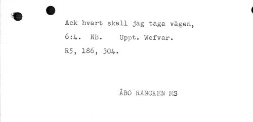 //// ^ Ack hvart skall jag taga vägen, //// 6:4. NB. Uppt. Wefvar. //// R5, 186, 304. //// ÅBO RANCREN MS ////