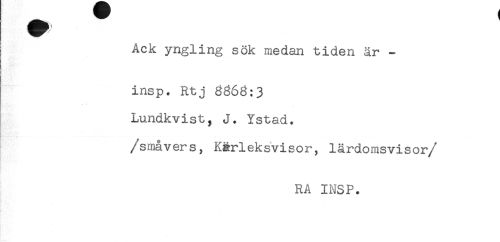 //// Ack yngling sök medan tiden är - //// insp. Rtj 3363:3 //// Lundkvist, J. Ystad. //// /småvers, Kärleksvisor, lärdomsvisor //// /. //// RA INSP. ////
