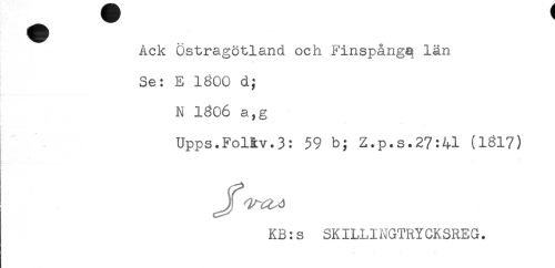 //// Ack Östragötland och Finspång^ län //// Se: E 1800 d; //// N 1806 a,g //// Upps.FoHv.3: 59 b; Z.p.s.27:41 (1817) //// & ' . * //// ! //// KB:s SKILLINGTRYCKSREG. ////