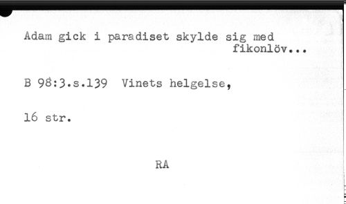 //// Adam gick i paradiset skylde sig med //// fikonlöv... //// B 96:3*s.139 Vinets helgelse, //// 16 str. //// RA ////