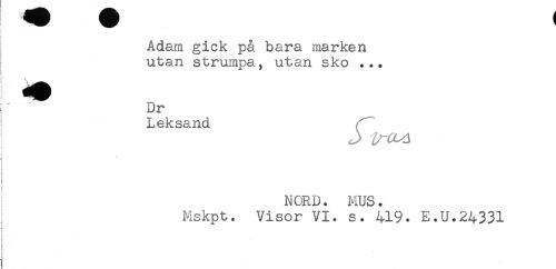//// Adam gick på bara marken //// utan strumpa, utan sko ... //// . ^ //// Dr //// Leksand //// J //// NORD. MUS. //// Mskpt. Visor VI. s. 419. E.U.24331 //// t ////