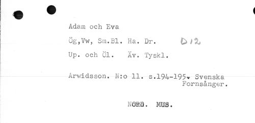 //// Adam och Eva //// ög,Vw, Sm.Bl. Ha. Dr. //// Up. och Öl. Äv. Tyskl. //// - - //// Arwidsson. N:o 11. s.194-195^ Svenska //// Fornsånger. //// NORB. MUS. ////