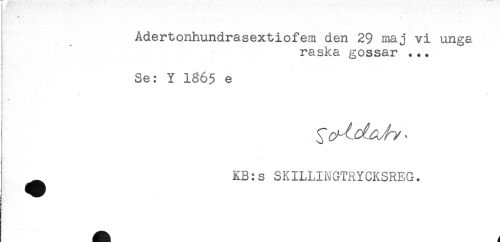 //// Adertonhundrasextiofem den 29 maj vi unga //// raska gossar ... //// Se: Y 1365 e //// i //// * //// ) //// t //// ^ KB:s SKILLINGTRYCKSREG. //// B ////