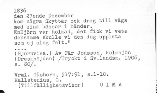 //// 1836 ' //// den 2?ende December //// kom några Skyttar ock drog till vägs //// med sina bössor i händer. //// EnBjörn var holmad, det fick vi veta //// densamme skulle vi den dag uppleta //// som ej slog felt. //// $ * * * //// (Björnvisa.) Av Pär Jonsson, Holmsjön //// (Dreskhöjden) /Tryckt i Sv.landsm. 1906, //// s. 80/. //// Vrml. Gåsborn, $17:91, s.l-lu. //// Kallstenius, G. //// (Tillfällighetsvisor) U L M A //// H ////