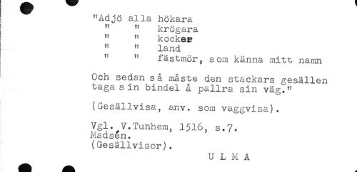 //// "Adjö alla hökara //// " " krögara //// " " kockep //// " " land //// " " fästmör, som känna mitt namn //// Och sedan så måste den stackars gesällen //// taga sin bindel å pallra sin väg." //// (Gesällvisa, anv. som vaggvisa). //// Vgl. V.Tunhem, 1516, s.7. //// Madsen. //// (Gesällvisor). //// U L M A ////