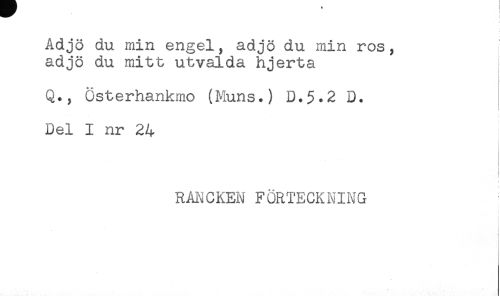 //// Adjö du min engel, adjö du min ros, //// adjö du mitt utvalda hjerta //// Q., Österhankmo (Muns.) D.5.2 D. //// Del I nr 24 //// ! //// RANCKEN FÖRTECKNING //// < //// i //// - //// - ////