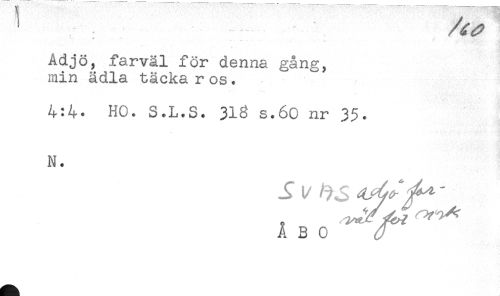 //// Adjö, farväl för denna gång, //// min ädla täcka r os. //// 4:4- HO. S.L.S. 313 s.60 nr 35. //// N. //// JJ t/ ' ////