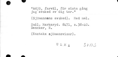 //// "Adjö, farväl, för sista gång //// jag avsked av dig tar." //// (Sjömannens avsked). Hed mel. //// Smål. Markaryd. 3471, s.3^-40. //// Dencker, N. //// (Enstaka sjömansvisor). //// i //// ULM A ////