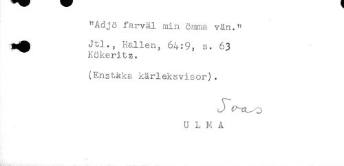 //// "Adjö farväl min ömma vän." //// Jtl., Hallen, 64:9, s. 63 //// Kökeritz. //// (Enstaka kärleksvisor). //// J ^-a^ j //// U L M A ////