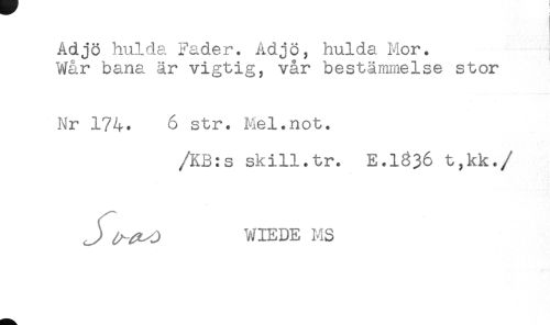 //// Adjö hulda Fader. Adjö, hulda Mor. //// Wår bana är vigtig, vår bestämmelse stor //// Nr 174. 6 str. Mel.not. //// /KB:s skill.tr. E.1^36 t,kk. //// /J WIEDE MS ////