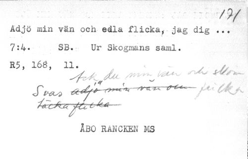 //// Adjö min vän och edla flicka, jag dig ... //// 7:4* SB. Ur Skogmans saml. //// R5, 16g, 11. //// ! //// ! //// ÅBO RANCKEN MS ////