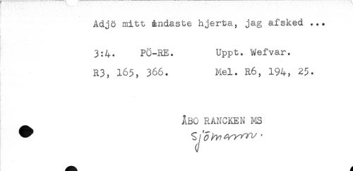 //// Adjö mitt Éndaste hjerta, jag afsked ... //// - //// 3:4. PÖ-RE. Uppt. Wefvar. //// R3, 165, 366. Mel. R6, 194, 25. //// ÅBO RANCKEN MS ////