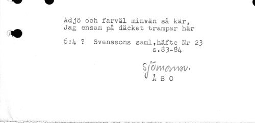 //// Adjö och farväl minvän så kär. //// Jag ensam på däcket trampar här //// 0:4 ? Svenssons saml.häfte Nr 23 //// s.83-84 //// ^ Å B 0 ////