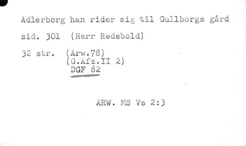 //// Adlerborg han rider sig til Gullborgs gård //// sid. 301 (Herr Redebold) //// 32 str. (Arw.73) //// (G.Afz.II 2) //// DGF 62 //// ARW. MS Vs 2:3 ////