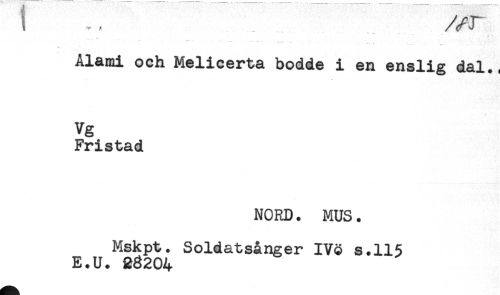 //// S - ' / v ^ //// ..- . //// Alami och Melicerta bodde i en enslig dal., //// Vg //// Fristad //// NORD. MUS. //// Mskpt. Soldats&nger IV3 s.115 //// E.U. 28204 ////