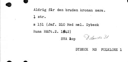 //// Aldrig får den bruden kronan mera. //// i)- str. //// s 151 (Jmf. D10 Med mel. Dybeck //// Runa Häft.2. 1#42) //// SVA Rop //// /DYBECK MS FOLKLORE 1 ////