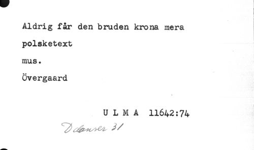 //// Aldrig får den bruden krona mera //// polsketext //// mus. //// Övergaard //// * //// U L M A 11642:74 ////