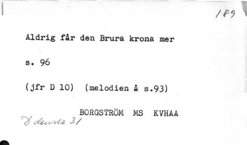 //// / <r 7 1 //// Aldrig får den Brura krona mer //// s. 96 //// (jfr D 10) (melodien å s.93) //// BORGSTRÖM MS KVHAA //// j //// /