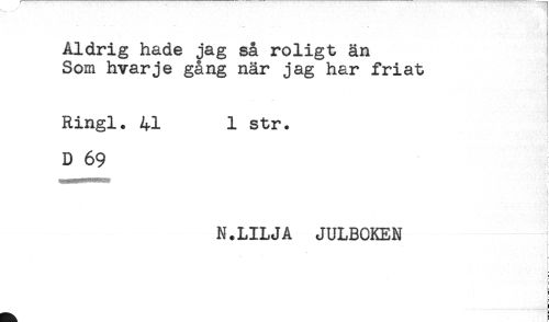 //// Åldrig hade jag så roligt än //// Som hvarje gång när jag har friat //// Ringl. 41 1 str. //// i //// t //// D 69 //// i //// ^ //// i //// ? //// ! //// - //// N.LILJA JULBOKEN //// i //// ' i //// f- //// ) //// b ////
