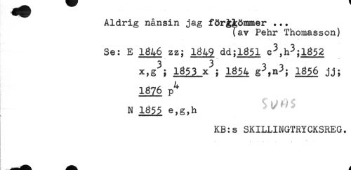 //// Aldrig nånsin jag förglömmer ... //// {av Pehr Thomasson) //// . - - ^ //// Se: E 1846 zz; 1849 dd;l851 c3,h3;i852 //// 1353 X^; 1854 g3,n3; 2^56 jj; //// 1876 p^ //// N 1855 e,g,h //// KB:s SKILLINGTRYCKSREG. //// , - - //// } //// i //// ) //// i ////